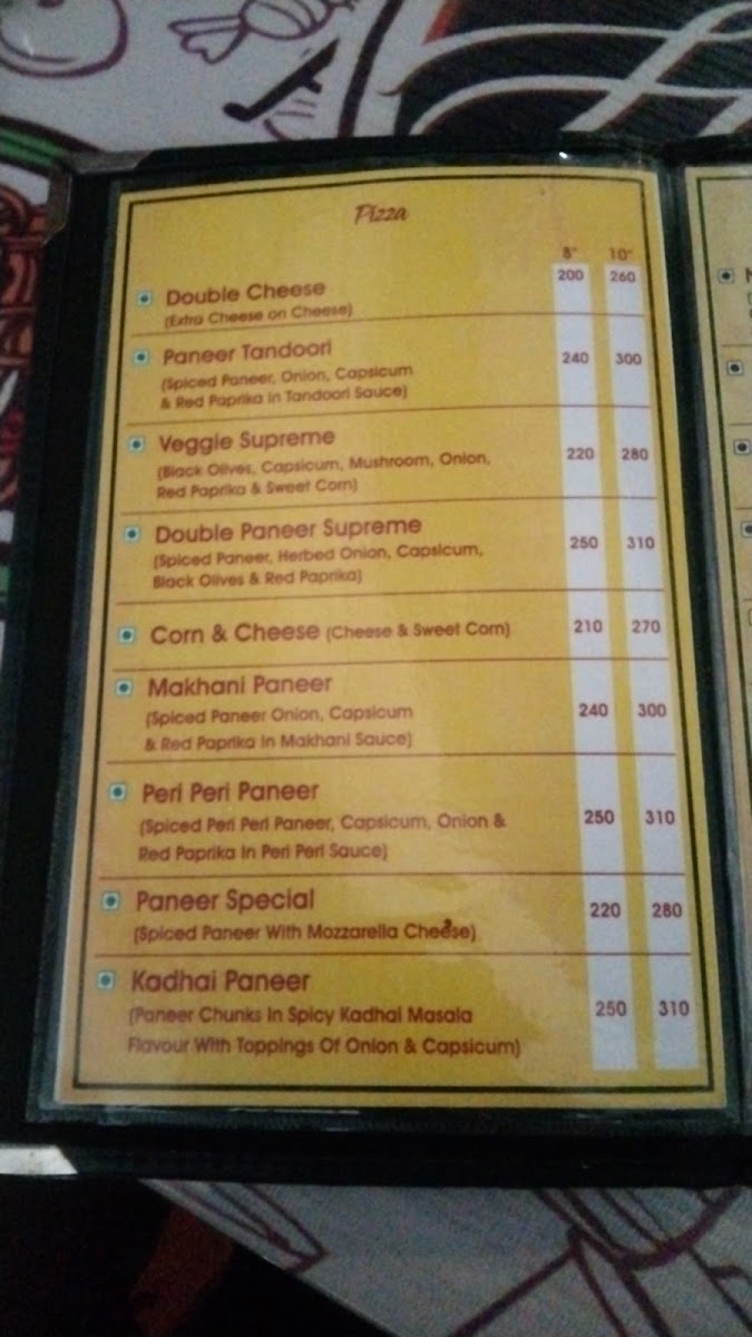 Pizzas include a selection of vegetarian choices such as Double Cheese, Veg. Kebab Surprise, Paneer Tandoori, Country Feast, Veggie Supreme, Double Paneer Supreme, Veggie Tandoori, and Corn & Cheese. These options feature different combinations of vegetables, cheese, and tandoori flavors.